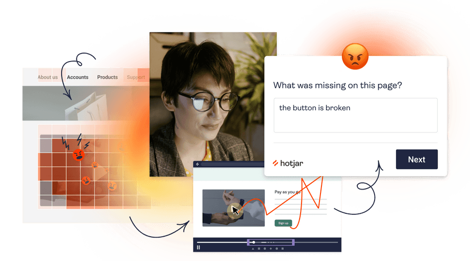 Convierte los clics en conversiones averiguando qué hacen los visitantes de tu sitio web y por qué con los insights visuales de Hotjar, el feedback de los usuarios y las entrevistas en tiempo real.